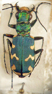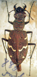 ♂ Cicindela (s. str.) sexguttata Fabricius, 1775 USA: Kansas, Wichita, Tallgrass Inn, 2.VI.2011 A.A. Komarov leg., A.S. Sazhnev det., 2012. |