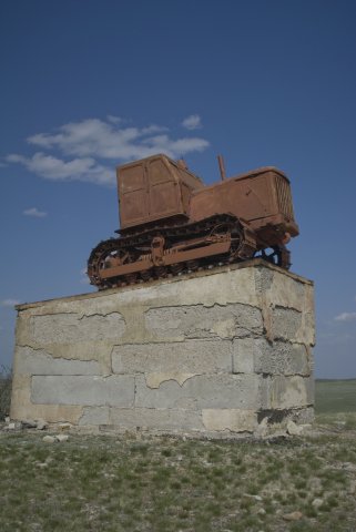 Должен пояснить, что Синегорск — это поселок, там тоже есть неплохие вершины, а Синие Горы расположены южнее в районе Модино, и туда то мы и хотели попасть. Выезжаем из Озинок в район Синегорска. Равнина резко сменилась холмами, между которыми петляло шоссе в сторону Казахстана. Через десяток километров замечаем большой холм с трактором на вершине. Осталось понять, как туда попасть. «Нива» доедет, а «Галант» жалко. Немного по петляли и вышли на грунтовку, что вела к вершине. Через десять минут, выйдя из машин на вершине, мы любовались открывшейся грандиозной панорамой. На запад простиралась зеленая степь с солончаком у подножья холма и редкими пасущимися коровами. На востоке внизу шоссе вело на границу, а за ним простиралась цепь холмов с лесистыми склонами, где «прятались» пограничники. На юго-западе просматривался поселок Непряхин. На постаменте стоит гусеничный красный трактор. Памятник целинникам. На памятнике сидит пастух, зорко следя за буренками, что паслись у подножья холма. Ни один мускул не дрогнул на его лице, при встрече с нами. Он был похож на гордого индейца, попавшего в плен. Для него, мы представляли собой наверное дикое зрелище.