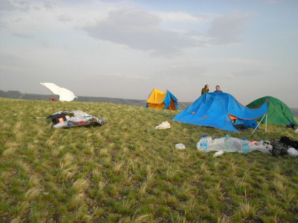 Палатки поставили быстро. Моя польская «старушка» сиротливо выглядела на фоне современного туристического жилья. Под скудным дерном, скрывались залежи щебня. Пришлось изрядно помаяться, забивая колышки растяжек. «Молодежь», к коей были отнесены Яша, и два Леши (Ковалев и Сажнев), после установки палаток, отправились на разведку местности. «Старикам» (Денис, Алексей Цылин и я), было поручено установить экран для ночного лова, приготовить ужин и вообще привести лагерь в надлежащий вид. Ведь нам предстояло здесь прожить пять дней и по мере возможности поглубже исследовать видовой состав жуков и других насекомых. Ничего не предвещало беды. Погода отличная, тепло, даже жарко, правда ветерок дул порывистый и какая то желтоватая мгла еле виднелась на востоке, но к вечеру наверняка все угомониться. «Добро» от погранцов получено, кругом зеленая степь, жуки нас ждут, компания и настроение отличные! Денис ставит экран, я занимаюсь кухней, Цылин нам помогает. Вскоре все готово, и экран, и ужин всухомятку. Горячее поставим чуть позже. Чтобы окончательно сломить барьеры стеснения, что нас разделяют, достаю батин самогон.