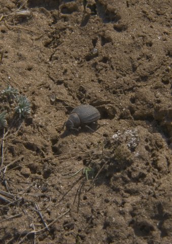 В коровьем навозе обнаружили пластинчатоусых и разную мелочевку. Солнце припекало сильнее, но свитера и куртки снимать было еще рано. На распаханной меже (от пожаров что ли опахивали?) хорошо были заметны крупные чернотелки Pimelia (Eurypimelia) subglobosa Pallas, 1781. Зверюги не проявляли особой активности и мирно грелись на солнышке.