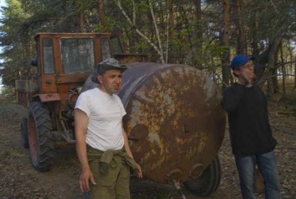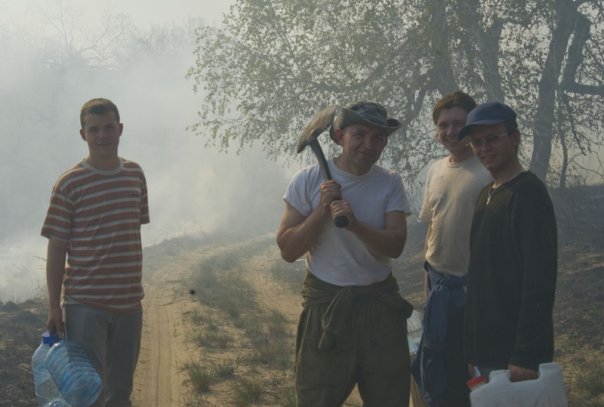 «Не прошло и года», как подъехал трактор с бочкой воды и пятеро местных. Наша молодежь помогает таскать воду в ведрах и канистрах для «пожарных» с ручными насосами в руках. Мы затушили почти весь фронт на нашем направлении, но земля пересохла настолько, что загоралась вновь и вновь. Силы у всех давно кончились. Работали как роботы на каком то «автопилоте». Носились с водой как заведенные. Полторы тонны воды кончились. Трактор покатил в село заправляться. Собираемся все на дороге и садимся курить.