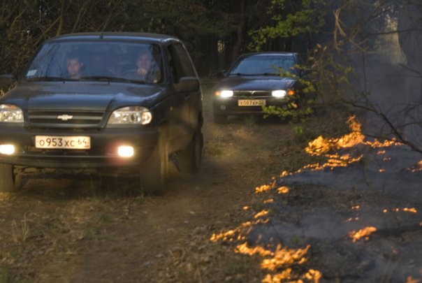 Сто тысячный раз обходим стоянку, в поисках забытых вещей. Забираем с собой мешок с мусором, последний раз окидываем взглядом бескрайнюю Волгу и командуем: «по коням!». А лес все горел. Горели сосны. Огонь местами вплотную подступал к дороге. Дымом была окутана даже федеральная трасса. Прощаемся с ребятами на перекрестке. Им на юг, в сторону Волгограда, а нам на север. Обнимаемся, жмем друг другу руки и договариваемся о встрече через пять дней в Саратове.